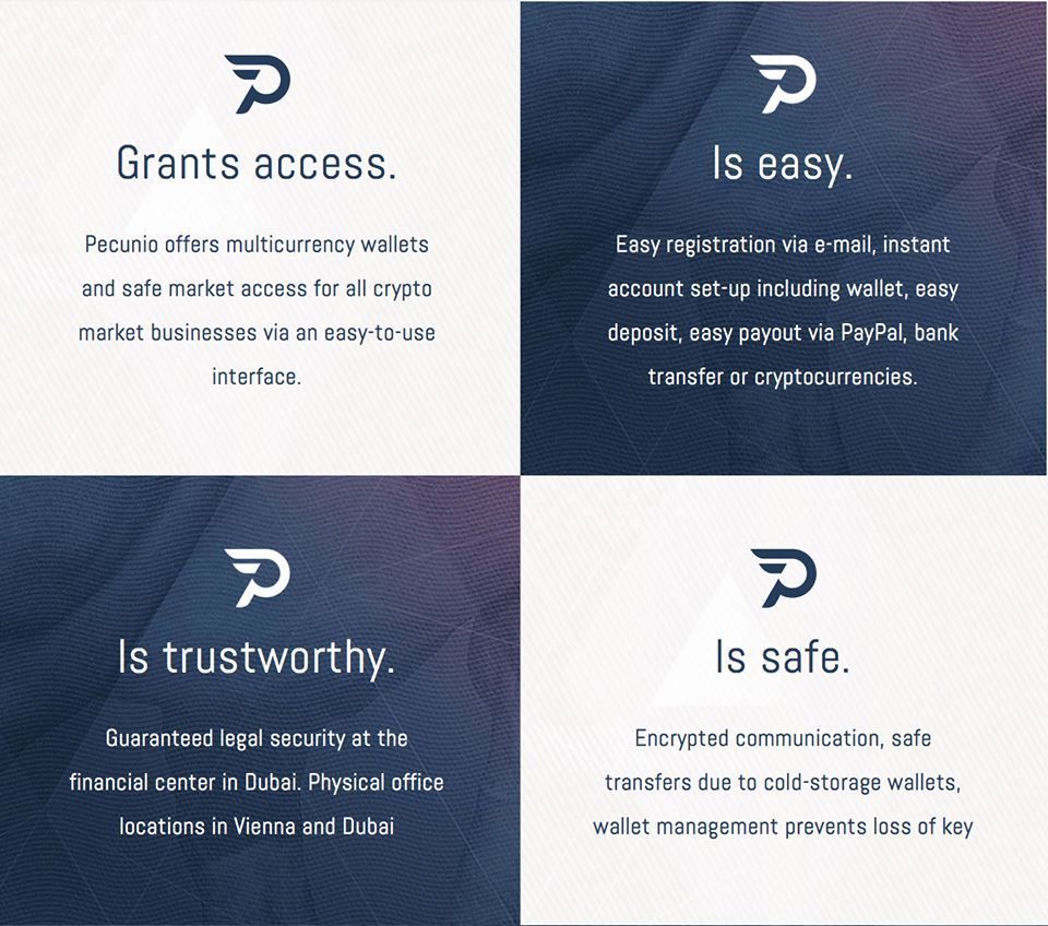 Pecunio juga mengkhususkan diri dalam menyediakan layanan konsultasi ahli untuk startups blockchain terkemuka dengan menyediakan setiap klien individu dengan rencana bisnis yang dibuat khusus karena kami mengenali keberagaman. Kami ingin membuka pasar cryptocurrency bersemangat untuk semua orang - demystifying investasi blockchain dan memungkinkan semua orang untuk berpartisipasi dalam ekonomi baru abad ke-21.Pecunio adalah platform investasi terdesentralisasi pertama di dunia yang telah dikembangkan untuk membuat investasi terkonsentrasi pada aset blockchain blue-chip. The World of Pecunio, mencakup seluruh siklus inovasi Blockchain, dari Angel & Venture Capital Investments, hingga Initial Coin Offerings, untuk menukarkan mata uang dan token yang diperdagangkan. Leverage untuk investor early bird Pecun.io jauh lebih tinggi daripada solusi investasi lain yang ada.