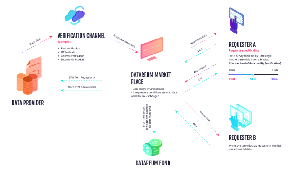 Data masuk ke pasar data yang dianalisis dan, menurut razia dari kontrak cerdas yang mengatur survei, data '5 diteruskan ke pemohon atau ditolak jika para peserta ditemui, sirkuitnya dilalui dan pembayaran ditransfer dari lokasi m escrow, ke penyedia data: ketika DTN dilepaskan dari escrow hem, komisi email dibayarkan ke hetwork Datareum, komisi Thts mewakili sumber pendapatan utama Datareum.